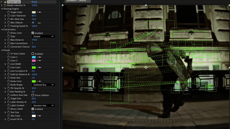 Isolate and track subjects instantly. TrackerLabs identifies your footage, locks onto it, and generates tracking boxes and network lines automatically. No manual masking or keyframing required.
